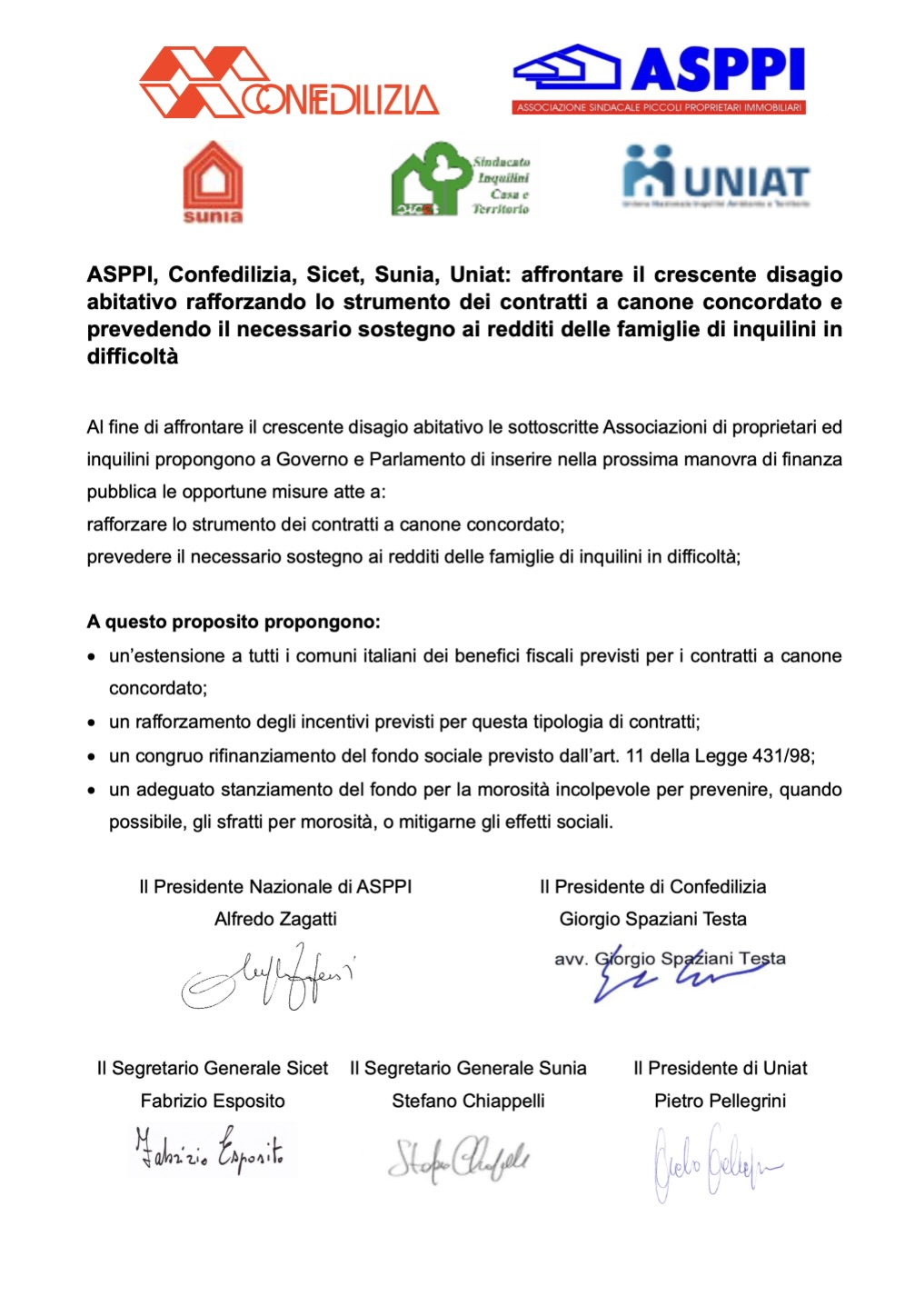 ASPPI, Confedilizia, Sicet, Sunia, Uniat: affrontare il crescente disagio abitativo rafforzando lo strumento dei contratti a canone concordato e prevedendo il necessario sostegno ai redditi delle famiglie di inquilini in difficoltà